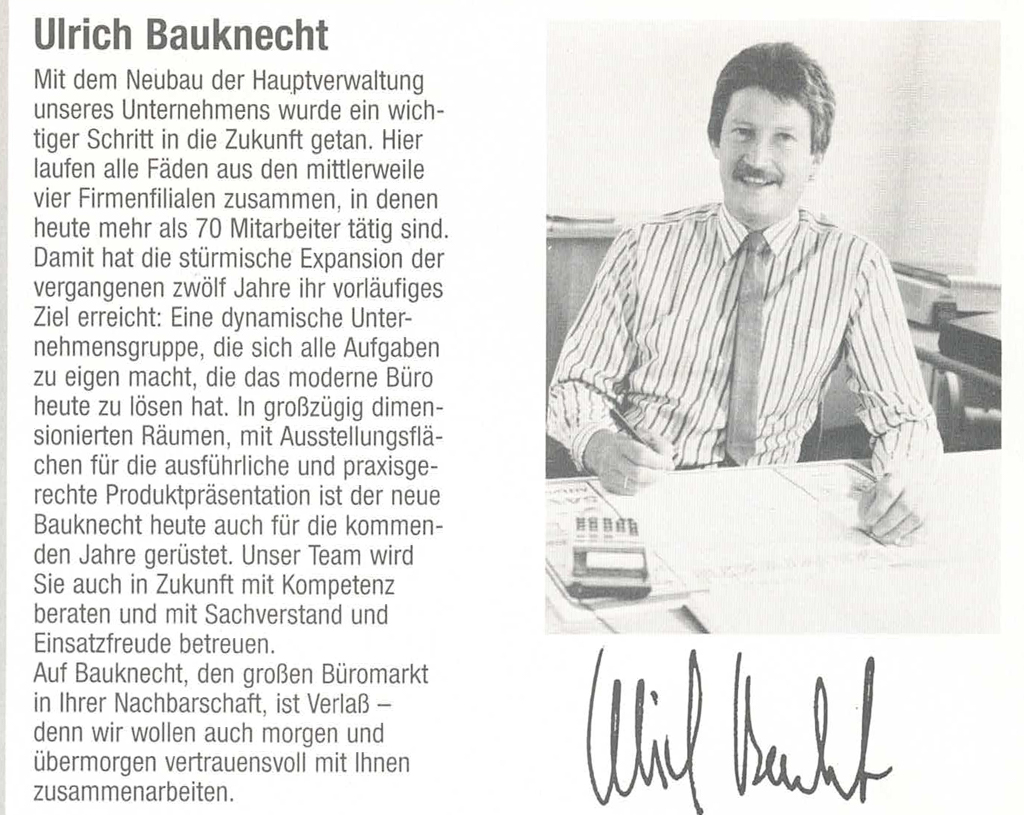 Ulrich Bauknecht, Enkel des Firmengründers, trat in das operative Geschäft ein. Mit viel Mut und Umsicht brach er mit der Tradition der Buchbinderei und widmete sich, nach dem Abschluss des Handelsfachwirtes, speziell der Bürobranche. Er nahm Schreib- und Rechenmaschinen in das Firmenprogramm auf und nutzte die „Revolution“ im Bürosektor für die Erweiterung der Firma.