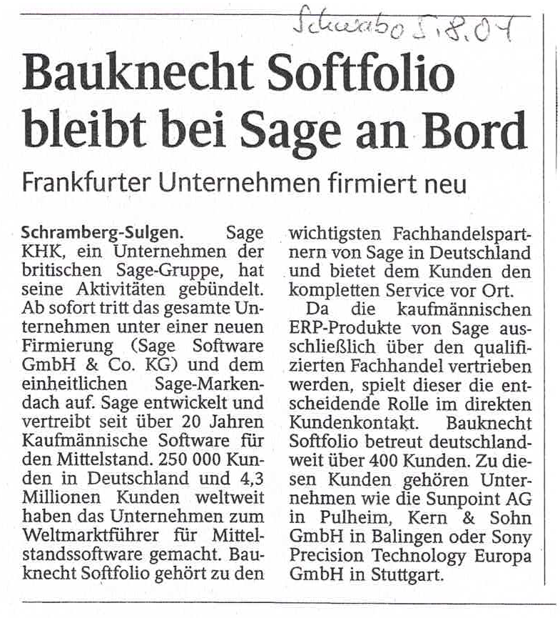 Im Rahmen eines Asset-Deals kauft Sage die Produktlinie Softfolio PPS und vermarktet diese fortan als Sage Office Line Produktion.